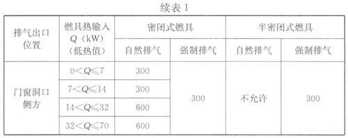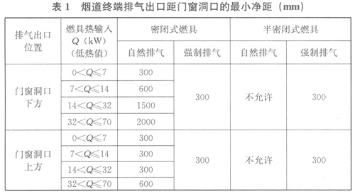 2我國住宅多數(shù)為多層或高層,多數(shù)燃具煙管高位安裝在本層門窗洞口上方,即安裝在上層住宅門窗洞口的下面了,故對上一層住宅的門窗洞口會有煙氣進入的問題產生。對居住房間(臥室和起居室)參照英、美標準進行了嚴格的安全間距規(guī)定(1.2~1.5)m,這與英、美單層住宅不同。