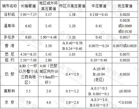 據(jù)西氣東輸長輸管道壓力工況,壓縮機出口壓力為10.0MPa,壓縮機進(jìn)口壓力為8.0MPa,這樣從輸氣干線引支線到城市門站,在門站前能達(dá)到6.0MPa左右,為城鎮(zhèn)提供了壓力高的氣源。提高輸配管道壓力,對節(jié)約管材,減少能量損失有好處;但從分配和使用的角度看,降低管道壓力有利于安全。為了適應(yīng)天然氣用氣量顯著增長和節(jié)約投資、減少能量損失的需要,提高城市輸配干管壓力是必然趨勢;但面對人口密集的城市過多提高壓力也不適宜,適當(dāng)?shù)靥岣邏毫σ赃m應(yīng)輸配燃?xì)獾囊?,又能從安全上得到保障,使二者能很好地結(jié)合起來應(yīng)是要點。參考和借鑒發(fā)達(dá)國家和地區(qū)的經(jīng)驗是一途徑。一些發(fā)達(dá)國家和地區(qū)的城市有關(guān)長輸管道和城市燃?xì)廨斉涔艿缐毫η闆r如表23。