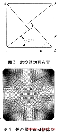 燃燒器切圓布置見圖3,從左下角逆時針旋轉(zhuǎn),燃燒器編號依次為1~4號角,1~4號角射流方向與前墻夾角均為42.5°,圖中虛線MN為計算結(jié)果分析時的輔助線。由于四角切圓鍋爐幾何區(qū)域的復(fù)雜性,采用直角坐標(biāo)系進行數(shù)值計算時,其每個角上的一二次風(fēng)的入口方向與直角坐標(biāo)的網(wǎng)格邊界的夾角約為45°,這就容易產(chǎn)生數(shù)值偽擴散[4],影響計算的準(zhǔn)確性。為減小偽擴散,本文采用平面網(wǎng)格體系(見圖4)。爐內(nèi)計算區(qū)域采用了六面體網(wǎng)格,由圖4可知,燃燒器噴口附近的節(jié)距較小,并呈輻射狀,以適應(yīng)燃燒器射流的發(fā)展,盡可能使流體流動方向與網(wǎng)格邊界的夾角遠(yuǎn)離45°,最大限度地以垂直于網(wǎng)格邊界的方向進入計算微元體。