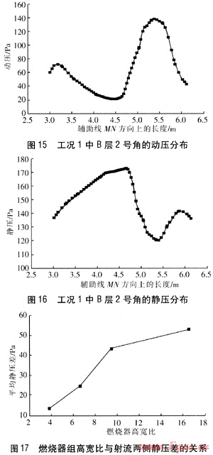 工況1中B層2號角的動壓分布見圖15,在輔助線MN方向上的長度為5.4m時,動壓達到最大,可以判斷這是燃燒器噴口噴出的射流中心所在的位置。工況1中B層2號角的靜壓分布見圖16,在輔助線MN方向上的長度為5.4m的兩側(cè),靜壓分別有兩個高峰值,這兩個峰值之差即為燃燒器噴口噴出的射流中心兩側(cè)的靜壓差,約32Pa。通過此種方法,可以計算出所有燃燒器射流中心兩側(cè)的靜壓差。各工況燃燒器射流中心兩側(cè)靜壓差平均值見表2,這里的平均靜壓差為各工況下所有燃燒器射流中心兩側(cè)靜壓差的算術(shù)平均值。由表2可知隨著高寬比的增加,燃燒器射流中心兩側(cè)平均靜壓差逐漸增大。