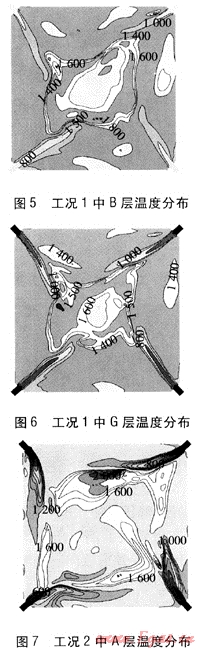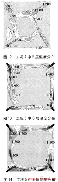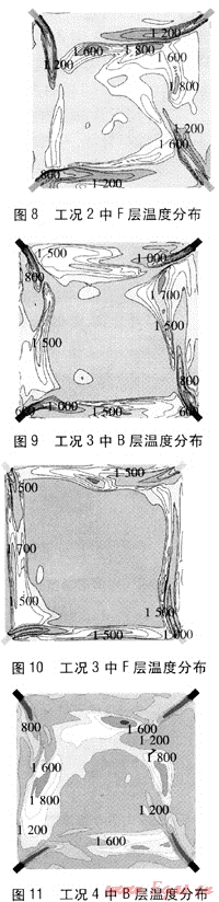 ⑤ 工況5中所有噴口全開,這時燃燒器的高寬比達到16.55。計算結(jié)果顯示,實際切圓直徑過大,氣流從燃燒器噴出后直接沖刷爐壁,由圖13、14可知,燃燒器平面的高溫區(qū)域均在壁面附近,這樣會在爐壁附近形成還原性氣氛,降低了灰熔點,運行中容易造成爐壁的結(jié)渣。