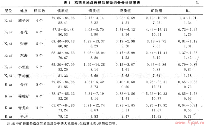 通常把煤中各種復(fù)雜的顯微有機(jī)組分按其性質(zhì)和成因劃歸3個組,即鏡質(zhì)組、殼質(zhì)組和惰質(zhì)組,以鏡質(zhì)組為主的腐殖煤形成的干酪根為腐殖型干酪根,通常是主要的生氣成分[2]。對雞西盆地8個礦區(qū)共40個樣本進(jìn)行煤巖顯微組分分析(分析結(jié)果見表1),殼質(zhì)組含量很低,城子河組范圍值為0.15%~6.69%,均值為2.68%;穆棱組范圍值為0.40%~5.65%,平均值為2.47%;鏡質(zhì)組含量普遍大于70%,城子河組平均值為81.33%,穆棱組平均值為79.12%,所以煤層不具備生油的物質(zhì)基礎(chǔ)但具備良好的生氣條件。鏡質(zhì)組反射率(Ro)是確定有機(jī)質(zhì)成熟度的重要指標(biāo)。城子河組煤巖樣本鏡質(zhì)體反射率的范圍為0.65%~1.91%之間,平均為1.18%,基本屬于肥、焦煤階段,穆棱組鏡質(zhì)體反射率的范圍為0.64%~1.23%之間,平均為0.77%,基本屬于氣、肥煤階段。兩個組有機(jī)質(zhì)演化均達(dá)到“低-中成熟”階段,處于“石油窗”內(nèi),可以大量生氣。