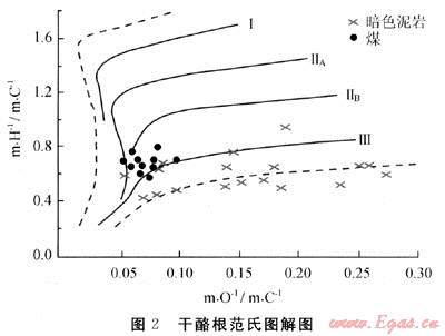 干酪根元素是劃分有機(jī)質(zhì)類型的重要指標(biāo),對雞西泥巖和煤巖進(jìn)行元素分析,原子比值統(tǒng)計(jì)暗色泥巖H/C為0.30~0.9,O/C為0.04~0.34;煤H/C為0.52~0.79,O/C為0.05~0.09;在范氏圖解中反映主要為腐殖型干酪根,部分為含腐泥的腐殖型,也反映主要以生氣為主[4](圖2)。