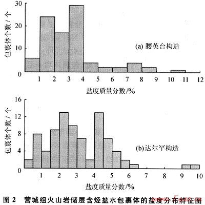 營(yíng)城組儲(chǔ)層中烴類包裹體以氣態(tài)包裹體為主,分布有少量液態(tài)包裹體,二者均以沿切穿石英礦物中的微裂隙成帶狀分布為主,為同期形成的。含烴鹽水包裹體的鹽度代表了當(dāng)時(shí)流體的鹽度性質(zhì),其鹽度的差別可以反映包裹形成期次的差別,腰英臺(tái)構(gòu)造帶與達(dá)爾罕構(gòu)造帶營(yíng)城組含烴鹽水包裹體鹽度存在一定的差別。根據(jù)其鹽度分布特征,腰英臺(tái)營(yíng)城組含烴鹽水包裹體鹽度質(zhì)量分?jǐn)?shù)介于1.0%~4.0%,為一期形成(圖2-a);達(dá)爾罕構(gòu)造帶營(yíng)城組含烴鹽水包裹體存在兩期(圖2-b),第一期含烴鹽水包裹體的鹽度質(zhì)量分?jǐn)?shù)介于2.0%~3.5%,第二期為4%~5%,第一期包裹體的鹽度與腰英臺(tái)構(gòu)造帶的較為接近,與烴類包裹體伴生的第二期鹽水包裹體在腰英臺(tái)構(gòu)造帶不發(fā)育。