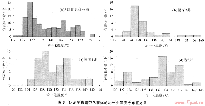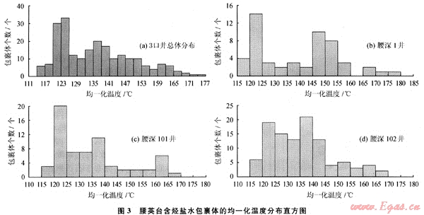 不同期次的包裹體均一化溫度分布頻率存在明顯的差別。因此,包裹體的均一化溫度可以作為判斷流體包裹體形成期次的有效參數(shù)[4~5]。根據(jù)腰英臺(tái)構(gòu)造帶腰深1、腰深101、腰深102井營(yíng)城組火山巖儲(chǔ)層中與烴類包裹體伴生的鹽水包裹體均一化溫度的分布特征分析表明(圖3),液態(tài)烴類與氣態(tài)烴類包裹體為同期形成產(chǎn)物,均一化溫度分布范圍為120~153℃,存在2個(gè)峰值,前峰值為液態(tài)烴類的充注高峰,均一化溫度分布介于120~129℃;后峰值為氣態(tài)烴類的充注高峰,均一化溫度分布介于132~141℃,氣態(tài)烴類充注高峰位于液態(tài)烴類充注高峰之后,但油氣基本上呈連續(xù)充注成藏。