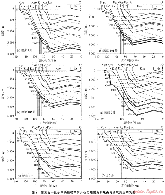 根據(jù)腰英臺(tái)構(gòu)造和達(dá)爾罕構(gòu)造部分井(腰深1井、腰深101井、腰深102井及達(dá)2井)的地層埋藏史、熱史(古地溫梯度)及流體包裹體均一化溫度資料綜合分析表明,腰英臺(tái)構(gòu)造帶油氣的成藏時(shí)間為距今93~84Ma,其中液態(tài)烴的充注高峰為距今93~89Ma,氣態(tài)烴的充注高峰為距今88~86Ma,由此表明油氣充注期為青山口組沉積后期至嫩江組末期(圖6-a、b、c);達(dá)爾罕構(gòu)造帶烴類充注為一期,充注時(shí)間為距今94~87Ma,為青山口組中期至嫩江組早期,達(dá)2井后期補(bǔ)充充注無機(jī)CO2,充注時(shí)間為距今85~81Ma,為嫩江組的后期至四方臺(tái)組早期,新近紀(jì)之后的產(chǎn)生的CO2為大規(guī)模的無機(jī)CO2的來源(圖6-d、e、f)。