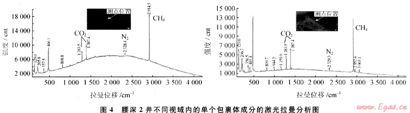 1) 長(zhǎng)嶺斷陷火山巖儲(chǔ)層既存在氣態(tài)烴包裹體,又存在液態(tài)烴類包裹體,但以氣態(tài)烴包裹體為主。氣態(tài)包裹體中含CH4外,還存在較多的CO2,其中達(dá)爾罕構(gòu)造營(yíng)城組包裹體中CO2含量較高,這與天然氣藏中CO2相對(duì)含量的變化趨勢(shì)一致。