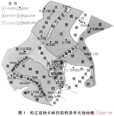 長(zhǎng)嶺凹陷位于松遼盆地中央坳陷帶南部,是在古生界變質(zhì)基底上發(fā)育起來的斷、坳疊置的晚中生代碎屑巖盆地,其東部為華字井?dāng)嗤?,南與西南隆起區(qū)毗鄰,西為西部斜坡區(qū)。腰英臺(tái)-達(dá)爾罕斷凸為位于長(zhǎng)嶺凹陷帶內(nèi)的1個(gè)正向構(gòu)造單元,其東南部和西北部分別長(zhǎng)嶺牧場(chǎng)次凹和乾安次凹2個(gè)生烴凹陷(圖1)。研究區(qū)構(gòu)造特征及演化總體表現(xiàn)為早期裂谷、中期坳陷、晚期褶皺的特點(diǎn),經(jīng)歷了斷陷、坳陷和萎縮褶皺3個(gè)大的構(gòu)造演化階段,斷陷期伴隨有多次火山活動(dòng),使得該地區(qū)斷陷層廣泛發(fā)育火山巖體,而且長(zhǎng)嶺斷陷層基底斷裂發(fā)育,斷陷延伸方向多為北北東向和北西向,是在古生代板塊或地塊(體)演化過程中形成的縫合帶或逆掩推覆斷裂系統(tǒng)的基礎(chǔ)上,經(jīng)過多次擠壓、走滑、伸展等不同方式的構(gòu)造活動(dòng)改造形成的,為火山巖儲(chǔ)集層天然氣成藏的主控因素。長(zhǎng)嶺斷陷層系包括登婁庫組、營(yíng)城組、沙河子組與火石嶺組,地球化學(xué)資料表明斷陷層營(yíng)城組天然氣主要來源于營(yíng)城組、沙河子組以及火石嶺組,天然氣氣源充足;廣泛發(fā)育火山巖系儲(chǔ)集層,鉆井資料揭示營(yíng)城組火山巖儲(chǔ)集層巖性主要為灰、灰綠色輝綠巖,玄武巖,安山巖及(裂隙發(fā)育)流紋巖,發(fā)育氣孔及杏仁構(gòu)造(充填物為方解石和硅質(zhì)),孔洞(氣孔)裂縫發(fā)育,并充填有方解石脈;登婁庫組和泉頭組可以作為區(qū)域性的蓋層,長(zhǎng)嶺斷陷火山巖儲(chǔ)集層成藏條件十分優(yōu)越,勘探前景廣闊[15~18]。目前已在腰英臺(tái)深層構(gòu)造帶腰深1與長(zhǎng)深1井營(yíng)城組與達(dá)爾罕構(gòu)造帶獲得了工業(yè)氣流,其余井位也有天然氣氣流顯示。