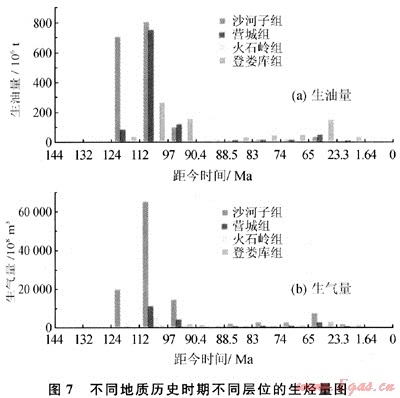 長(zhǎng)嶺斷陷營(yíng)城組和沙河子組烴源巖的生烴特征均表現(xiàn)為一次持續(xù)生烴,沙河子組烴源巖干酪根類型主要為腐殖型,以生氣為主,可能會(huì)有少量的原油生成,沙河子組烴源巖在登婁庫組的早期進(jìn)入生油門限,但生油量很低,由于地層持續(xù)沉降,地溫變化快,登婁庫組后期開始進(jìn)入生氣階段,至泉頭組中后期進(jìn)入生氣高峰。營(yíng)城組早期發(fā)生大規(guī)模的火山活動(dòng),主要以火山巖分布為主,烴源巖不甚發(fā)育,分布相對(duì)局限。如圖7所示,營(yíng)城組與沙河子組在泉頭組沉積早期(距今110Ma左右)達(dá)到生油高峰,泉頭組的后期至青山口組沉積早期(距今105Ma左右)達(dá)到生氣高峰,青山口組沉積后期開始衰減,至距今90Ma左右生烴基本終止,與天然氣的成藏期較為匹配,而白堊紀(jì)末以后,生氣速率逐漸降低,至古近紀(jì)時(shí)期仍可補(bǔ)充部分天然氣,但是氣量較少,此時(shí)由于后期的構(gòu)造運(yùn)動(dòng)產(chǎn)生較多的CO2,充注至研究區(qū),形成了一些CO2與有機(jī)烷烴氣的混合氣藏。此外,長(zhǎng)嶺斷陷深層早期形成的油藏和分散的液態(tài)烴,至白堊紀(jì)末以后溫度已達(dá)到裂解溫度(大于200℃)。中淺層有良好的蓋層封閉條件,早期形成的油氣沒有大規(guī)模損失破壞,后期演變?yōu)楣腆w瀝青,充填于巖石礦物的裂隙之間,對(duì)儲(chǔ)層成巖作用有重要的抑制作用。