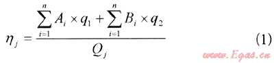 單個(gè)加氣站的日加氣負(fù)荷率:某個(gè)加氣站日負(fù)荷率(ηj)是指該加氣站售氣量與該加氣站供氣能力(Qj)的比值,該加氣站的售氣總量等于當(dāng)日所有汽車加氣量的總和。q1、q2分別是公交車與出租車的日平均加氣量。