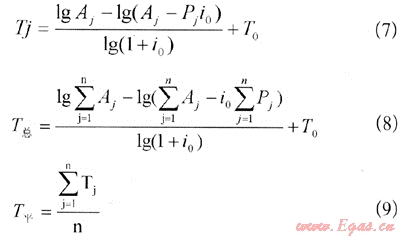 分別將j個(gè)加氣站投資回報(bào)期(Tj)、所有加氣站總投資回報(bào)期(T總)、及加氣站平均投資回報(bào)期(T平)代入上式,得到以下各公式: