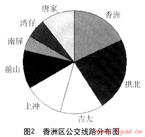珠海市公交線路主要由珠海市公共汽車公司及珠海信禾西部公共汽車有限公司兩家公司經(jīng)營(yíng)。珠海市公共汽車公司公交線路共有59條,車輛1000多臺(tái)。其中在香洲區(qū)內(nèi)行駛的線路有48條,其余11條線路連接香洲區(qū)與另外兩市轄區(qū);珠海信禾西部公共汽車有限公司共有公交線路45條,車輛350多臺(tái),主要營(yíng)運(yùn)在斗門區(qū)、金灣區(qū)兩區(qū),其中約40%的線路用于連接香洲區(qū)與另外兩市轄區(qū)。綜合上述數(shù)據(jù)可見(jiàn),珠海市超過(guò)80%的公交線路營(yíng)運(yùn)或經(jīng)過(guò)香洲區(qū)。香洲區(qū)的公交線路主要集中于香洲、拱北、吉大、上沖、前山、灣仔、唐家及南屏,具體分布詳見(jiàn)圖2。