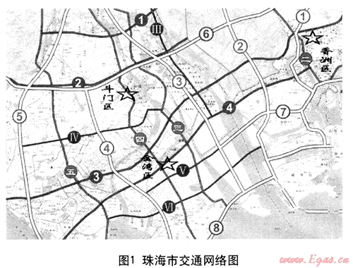 珠海市位于珠江口西南部,緊鄰澳門特別行政區(qū),是我國(guó)早期設(shè)立的經(jīng)濟(jì)特區(qū)之一。設(shè)香洲區(qū)、斗門區(qū)、金灣區(qū)三個(gè)市轄區(qū),總?cè)丝?50~350萬(wàn)人?,F(xiàn)階段,珠海市只有單一的公路運(yùn)輸交通模式。如圖1珠海市交通網(wǎng)絡(luò)圖所示,珠海市由5縱4橫共9條主干道,6條加密線及8條城際高速公路組成的交通系統(tǒng)。車流輛呈3個(gè)圈的片區(qū)狀布置,片區(qū)之間為30~60min車程,并呈現(xiàn)香洲區(qū)強(qiáng),其他兩市轄區(qū)弱(其他兩市轄區(qū)之和遠(yuǎn)小于香洲區(qū))。可見(jiàn),加氣站的重點(diǎn)、難點(diǎn)應(yīng)放在香洲區(qū)加氣站的網(wǎng)絡(luò)布置。結(jié)合珠海市交通現(xiàn)狀,加氣站投建初期會(huì)呈現(xiàn)香洲區(qū)數(shù)目多、規(guī)模較大,其他兩市轄區(qū)較少的分布格局。