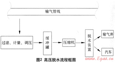 (2) 站址靠近高壓管線,對于燃氣供應系統(tǒng)來說,壓力就是財富,可以充分利用高壓管線壓力,從高壓系統(tǒng)中取氣壓縮。由于市政管道內(nèi)天然氣氣質(zhì)良好,而且壓力相對較高,此情況下高壓脫水、低壓脫水均可采用,具體視項目實際情況確定。