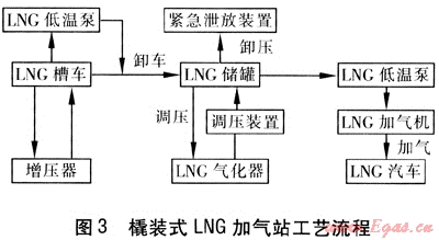 橇裝式LNG加氣站將LNG通過(guò)低溫泵向LNG汽車(chē)加氣。如有需要,也可同時(shí)經(jīng)高壓液體泵加壓、經(jīng)氣化器氣化后向CNG汽車(chē)加氣,并且比同樣容量CNG加氣站的造價(jià)和運(yùn)行費(fèi)用低。另外,橇裝式LNG加氣站還有以下優(yōu)勢(shì):
