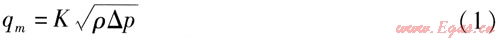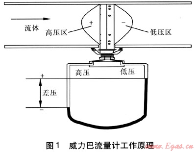 威力巴流量計采用一種差壓式的流量探頭,其計算模型和其他差壓式流量計(如孔板流量計[7~8])的數(shù)學模型相同。威力巴流量計的工作原理見圖1。其計算模型為:
