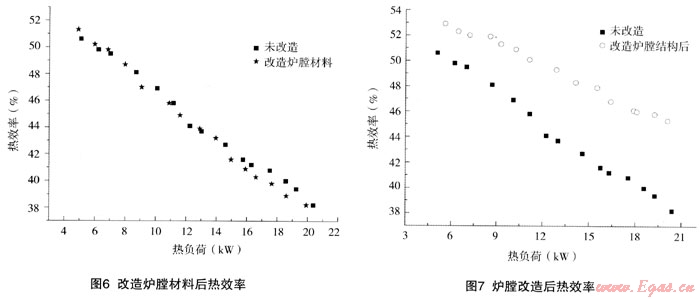 (2) 爐膛材料雖對(duì)熱效率影響不大,但將普通粘土磚改為硅酸鋁板,可加快爐膛溫升,降低鍋圈溫度和爐膛無(wú)效蓄熱,改善操作環(huán)境。