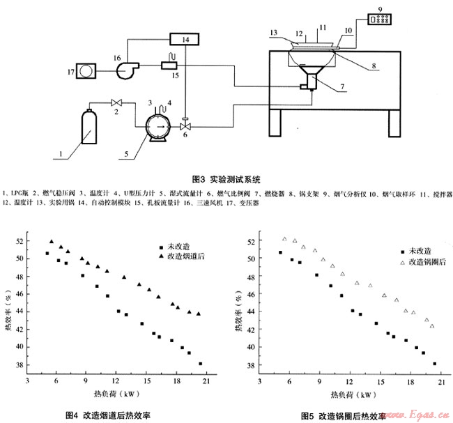 為對(duì)比改造前后中餐灶熱效率,在原有額定負(fù)荷為18kW的紅外中餐燃?xì)庠畹幕A(chǔ)上對(duì)爐膛進(jìn)行煙道、鍋圈和爐膛結(jié)構(gòu)的改造,并對(duì)改造后的熱效率進(jìn)行測(cè)試,實(shí)驗(yàn)裝置的布置和流程如圖3所示。