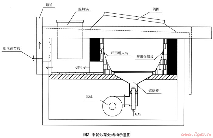 圖2為中餐灶結(jié)構(gòu)示意岡,爐膛結(jié)構(gòu)主要影響煙氣對(duì)流換熱,煙氣主要分為兩部分:一是經(jīng)鍋圈排煙氣,其對(duì)熱效率影響較大;二是經(jīng)煙道排炯?xì)?,其一般加熱溫鍋灶后再排出,排煙溫度約在200℃以上。經(jīng)過(guò)鍋圈流出煙氣主要是以對(duì)流方式加熱鍋底和鍋側(cè),提高速度有利于提高對(duì)流換熱,則鍋與爐膛耐火保溫材料間隙、鍋圈與鍋之間間隙成為重要因素。另外,兩股氣流的分配也影響到中餐灶的熱效率。