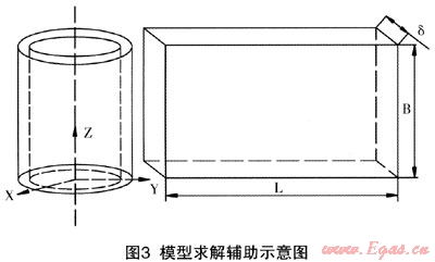 將問題簡(jiǎn)化為等截面直肋導(dǎo)熱問題后,為便于求解,首先需確定直肋的高度、寬度、厚度、周邊長(zhǎng)度及橫截面積。將鋼管沿著軸向垂直剖開后,變成以管周長(zhǎng)(L)為寬,以管長(zhǎng)(B)為高度,以管道壁厚(δ)為長(zhǎng)度的直肋模型,如圖3所示。