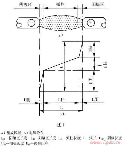 焊接電弧在其軸線方向由陰極區(qū)、陽(yáng)極區(qū)和弧柱3部分所組成,見圖1。