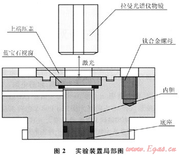 圖2為拉曼光譜原位觀測(cè)裝置的局部圖,拉曼光譜儀的激光透過(guò)藍(lán)寶石窗口聚焦在水合物表面,可得到水合物的拉曼光譜圖。反應(yīng)釜分為上下兩個(gè)部分,兩部分的結(jié)合部借鑒了相機(jī)和鏡頭的卡口結(jié)構(gòu),便于開(kāi)閉。釜體上部的壓蓋采用螺釘壓緊,螺釘、上端壓蓋、藍(lán)寶石視窗以及容器寶石密封端就成為一個(gè)整體。這一部分通過(guò)與一個(gè)帶有“O”形圈密封的容器底座結(jié)合,形成一個(gè)密封的壓力容器腔。腔體內(nèi)部設(shè)有內(nèi)膽,容積約1.1mL,用于裝填反應(yīng)介質(zhì)。