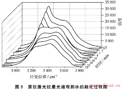 圖5是原位激光拉曼光譜測(cè)定冰融化過(guò)程的譜圖,從該譜圖中可以看到,隨著系統(tǒng)溫度的不斷升高,冰的四面體結(jié)構(gòu)逐漸瓦解,氫鍵數(shù)目逐漸減少,峰包的高波數(shù)側(cè)不斷上揚(yáng),而低波數(shù)端不斷消亡,從該譜圖上看冰的融化過(guò)程幾乎是水結(jié)冰的逆過(guò)程。