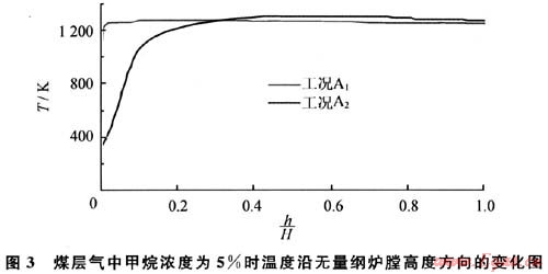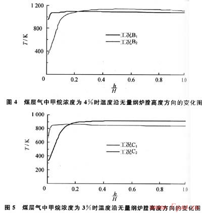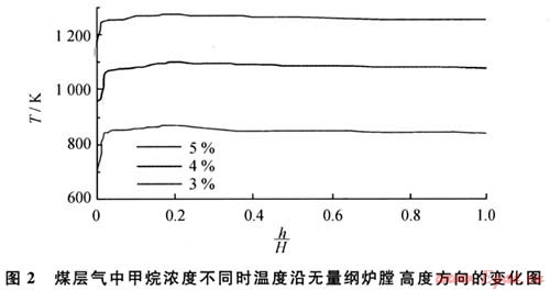 在3種工況條件下,h/H大于0.05時(shí)爐膛溫度均大于840K,而甲烷的著火溫度為811K。當(dāng)爐膛的溫度大于甲烷的著火溫度時(shí)就可以維持燃燒,這說明在煤層氣中甲烷濃度不低于3%時(shí),利用流態(tài)化蓄熱裝置可以維持燃燒。對(duì)計(jì)算區(qū)域溫度取平均值并定義為爐膛的平均溫度,當(dāng)煤層氣中甲烷濃度為5%、4%、3%時(shí),爐膛的平均溫度分別為1256K、1080K、842K。煤層氣中甲烷濃度由5%下降到4%時(shí),爐膛平均溫度下降,溫度下降值△T1為176K;煤層氣中甲烷濃度由4%下降到3%時(shí)溫度下降值△T2為238K??梢?,隨著煤層氣中甲烷濃度的下降,溫度降低,并且下降幅度有增大趨勢(shì),可以判斷,當(dāng)煤層氣中甲烷濃度低于3%時(shí),爐膛溫度迅速降低并低于甲烷的著火溫度811K,無法維持煤層氣在爐膛中的燃燒,這和數(shù)值模擬中當(dāng)煤層氣中甲烷濃度低于3%時(shí)不能燃燒的計(jì)算結(jié)果是一致的。所以流化床蓄熱裝置燃燒超低濃度煤層氣的著火極限濃度為3%。