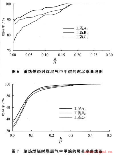 圖7顯示了絕熱燃燒時(shí)煤層氣中的甲烷沿高度方向的燃盡率。對(duì)比圖6和圖7,不難看出,在絕熱燃燒條件下,煤層氣中的甲烷完全燃盡的高度在h/H為0.4附近,而采用蓄熱顆粒的條件下,煤層氣中的甲烷完全燃盡的高度出現(xiàn)在h/H為0.2附近。由于蓄熱顆粒的存在,使燃燒反應(yīng)向布風(fēng)板方向推移。