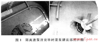 隔離液的流變性應(yīng)能保證在較低排量下達到紊流,有效地解決沉降穩(wěn)定性與流變性之間的矛盾,實現(xiàn)紊流驅(qū)替,充分頂替不規(guī)則井眼中殘留的鉆井液,有效清除井壁上的虛濾餅和套管壁上的油膜或鉆井液吸附層,從而提高界面膠結(jié)質(zhì)量[6]。由圖1可以清楚地看到,固井施工完畢時混漿罐底部無沉降的重晶石,說明隔離液的沉降穩(wěn)定性完全滿足固井作業(yè)的要求。此外,還可采用水泥車即配即打的方式,配制隔離液的同時往井內(nèi)泵注隔離液開始固井作業(yè)。