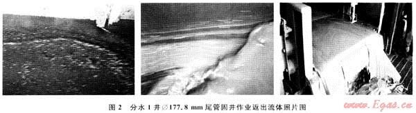 該技術(shù)已在川渝地區(qū)“三高”氣田多口超深井尾管固井作業(yè)中得到了成功應(yīng)用,以分水1井為例(2008年中石油陸上第一口超深井,井深為7353.84m),該井Ø177.8mm尾管固井采用前后隔離液防污染技術(shù),先注20m3前隔離液,中心管附近注6m3后隔離液,有效隔離了鉆井液和水泥漿,防止頂替過程和拔中心管后水泥漿和鉆井液直接接觸引發(fā)井下復(fù)雜。施工時間為4.5h,泵注水泥漿和頂替過程以及拔中心管后大排量循環(huán)鉆井液期間,泵壓平穩(wěn)。碰壓為19MPa,碰壓后起鉆5柱未遇阻,鉆具懸重與稱重時基本一致,后以1.8m3/min大排量正循環(huán),鉆井液、隔離液以及水泥漿返出界面清晰,相互之間無較嚴重污染現(xiàn)象,3種流體及摻混段流動性均很好,充分說明隔離液與水泥漿化學(xué)兼容性良好。井口返出流體照片從左至右分別是鉆井液、隔離液和水泥漿(見圖2)。