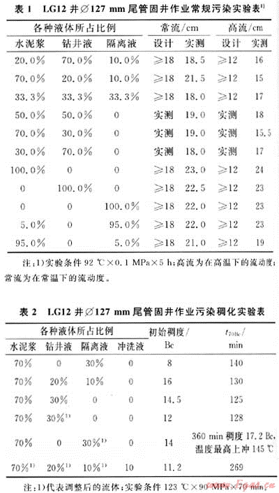 3) 必須開展隔離液與水泥漿的污染稠化實驗,保證隔離液對水泥漿的稠化時間無不良影響,避免固井工程事故的發(fā)生。