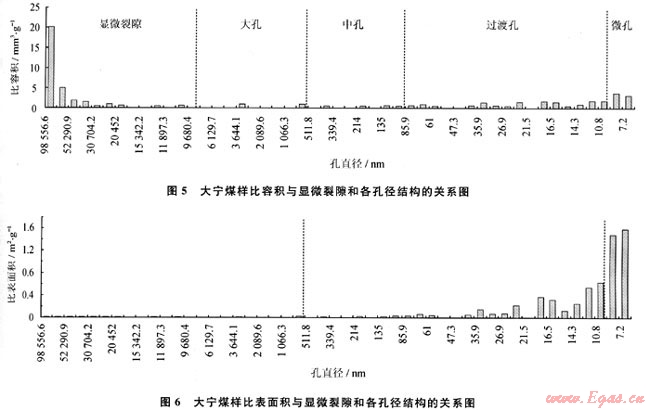 在煤層氣排采過程中,當(dāng)儲層壓力、水產(chǎn)量處于連續(xù)穩(wěn)定下降階段時,氣產(chǎn)量仍然呈現(xiàn)出較大的波動,其影響因素是煤層氣的解吸特征,最終受控于煤的孔徑結(jié)構(gòu)。煤中顯微裂隙(壓汞孔徑D>10000nm)和各孔徑(大孔:1000nm<D<10000nm;中孔:100nm<D<1000nm;過渡孔:10nm<D<100nm;微孔D<10nm)的比容積、比表面積的分布是不連續(xù)的(圖5、6),比容積主要分布在顯微裂隙、過渡孔和微孔中,比表面積則以微孔和過渡孔占絕對優(yōu)勢(表1、2)。在煤層氣的解吸過程中,當(dāng)解吸到某一孔徑段時,因孔容、孔表面積的變化導(dǎo)致產(chǎn)氣速率變化,氣產(chǎn)量也呈現(xiàn)波動(盡管氣產(chǎn)量是一個綜合效應(yīng),當(dāng)解吸到某一優(yōu)勢孔徑時氣產(chǎn)量仍然會呈現(xiàn)出強勢)。