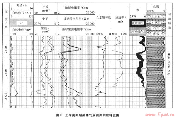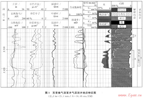 以往對儲層進行氣水或油氣判別時,主要基于天然氣的低含氫指數(shù)及挖掘效應(yīng),氣層視中子孔隙度降低,而聲波和密度視孔隙度增高,且其差別越大,越符合氣層特征。但在測井解釋中卻發(fā)現(xiàn)有些高產(chǎn)氣層的視中子孔隙度并不很低,而密度、聲波視孔隙度卻增大不多,故經(jīng)常導(dǎo)致氣水或油氣判別失誤[1~2]。如圖1和圖2所示,它們分別是蘇里格氣田某井產(chǎn)氣3.89×104m3/d氣層和土庫曼斯坦氣田某井產(chǎn)氣21.0×104m3/d氣層的測井響應(yīng)特征,顯然高產(chǎn)氣層的視孔隙度關(guān)系反而更接近水層特征。