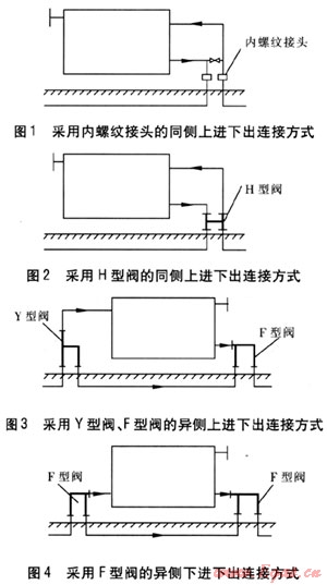 散熱器連接方式推薦采用以下4種:a.同側(cè)上進(jìn)下出(見圖1),塑料管出地面后,采用內(nèi)螺紋接頭與地面上鍍鋅鋼管連接,安裝簡(jiǎn)單,造價(jià)低,出地面只有一處,工程中經(jīng)常采用。b.同側(cè)上進(jìn)下出(見圖2),塑料管出地面后,采用H型閥與地面上鍍鋅鋼管連接,安裝簡(jiǎn)單,出地面只有一處,但H型閥價(jià)格高,工程中較少采用。c.異側(cè)上進(jìn)下出(見圖3),塑料管出地面后,采用Y型閥和F型閥與地面上鍍鋅鋼管及散熱器連接,出地面有兩處,造價(jià)高。d.異側(cè)下進(jìn)下出(見圖4),塑料管出地面后,采用兩個(gè)F型閥與地面上散熱器連接,出地面有兩處,造價(jià)高。