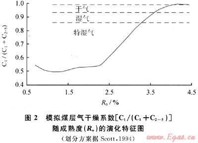 C1/(C1+C2-5)系數(shù)在指示煤層氣特征方面具有比CO2含量更好的優(yōu)勢,體現(xiàn)在這一指標(biāo)參數(shù)受到外界的影響較小,具有相對穩(wěn)定性。這主要因為甲烷和重?zé)N氣體均具有比較相似和穩(wěn)定的物理性質(zhì)。圖2為模擬煤層氣的C1/(C1+C2-5)系數(shù)隨Ro的變化關(guān)系。C1/(C1+C2-5)系數(shù)值隨成熟度的增加,首先出現(xiàn)先短暫降低,在大約位于Ro=1.0%處達(dá)到最低值0.5,之后呈持續(xù)增大趨勢。Scott等[4]將C1/(C1+C2-5)系數(shù)值小于0.86定義為特濕煤層氣,0.86~0.94為濕氣,0.94~0.99為干氣,大于0.99為特干氣。當(dāng)Ro達(dá)到4.0%以后,模擬的煤層氣C1/(C1+C2-5)系數(shù)值均大于0.99,達(dá)到了特干氣的程度。而達(dá)到干氣的時間是Ro=3.6%,其余的成熟度演化階段中生成的煤層氣主要以濕氣和特濕氣為主。在一些煤層氣藏分布區(qū),煤鏡質(zhì)體反射率小于4.0%時,干燥系數(shù)C1/(C1+C2-5)值也可達(dá)到0.99,如我國的沁水盆地、鄂爾多斯盆地和阜新盆地等。