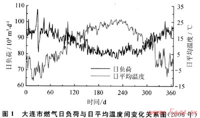 根據(jù)本文參考文獻(xiàn)[10]、[11]可知,在各類氣象因素中,溫度是影響城市燃?xì)庳?fù)荷的核心因素。圖1為大連市2006年全年燃?xì)馊肇?fù)荷隨日平均溫度的變化情況,從中不難發(fā)現(xiàn)二者間存在緊密的反向變化關(guān)系。