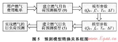 通常,燃?xì)庳?fù)荷的月負(fù)荷預(yù)測(cè)模型比較容易建立。因?yàn)?,通過統(tǒng)計(jì)待預(yù)測(cè)地區(qū)的月燃?xì)赓M(fèi)用賬單,就能夠比較方便地建立月負(fù)荷預(yù)測(cè)模型。相反,由于目前我國城市燃?xì)庳?fù)荷計(jì)量體系尚不完備,因此燃?xì)馊肇?fù)荷計(jì)量數(shù)據(jù)的收集較為困難,這也給燃?xì)馊肇?fù)荷的預(yù)測(cè)帶來諸多不便。所以我們可以利用上述方法,通過預(yù)測(cè)模型(9)來間接地得到燃?xì)馊肇?fù)荷預(yù)測(cè)模型,從而實(shí)現(xiàn)燃?xì)馊肇?fù)荷預(yù)測(cè)。其轉(zhuǎn)換關(guān)系如圖5所示。