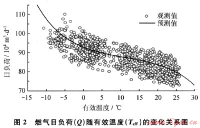 根據(jù)大連市近年來燃?xì)馊肇?fù)荷的觀測(cè)數(shù)據(jù),繪制工作日期間燃?xì)馊肇?fù)荷(Q)隨有效溫度(Teff)的變化關(guān)系曲線,如圖2所示。