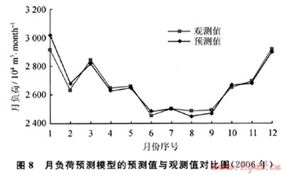 根據(jù)2.2所介紹的方法,以2006年為例,得到燃?xì)庠仑?fù)荷預(yù)測(cè)模型的預(yù)測(cè)結(jié)果,如圖8所示。