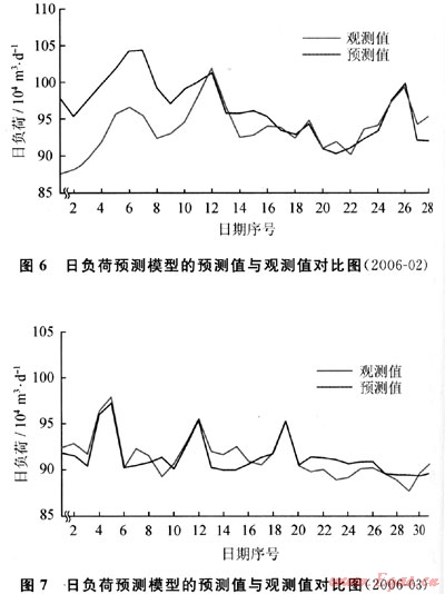 根據(jù)2.1所介紹的方法,分別以2006年2月(最不利工況)和2006年3月(常規(guī)工況)為例,得到燃?xì)馊肇?fù)荷預(yù)測(cè)模型的預(yù)測(cè)結(jié)果,如圖6、7所示。