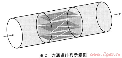 1) 與三、四聲道流量計相比,以特別方式排列的六聲道超聲波流量計有以下的決定性優(yōu)點:①抗干擾性。根據高斯-切比雪夫(Gauss-Chebyshev)理論排列聲道,并且聲道相互交叉,使流量計很大程度上不受氣體流型的影響。因此,可以不需要整流器甚至在氣體流動受到渦流、不對稱等干擾的情況下也可以實現高精度的測量。②冗余性。如果其中任何一個或兩個聲道失效,六聲道流量計將不會失去計量能力,失效的聲道可以通過重新復值來得到恢復。
