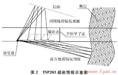 該方法屬于施工過程中的長(zhǎng)距離地質(zhì)預(yù)報(bào)方法,在宏觀預(yù)報(bào)的指導(dǎo)下,主要應(yīng)用TSP 203探測(cè)、斷層參數(shù)預(yù)測(cè)和地面地質(zhì)體投射等技術(shù)手段,對(duì)隧道隧洞洞體前方100~150m不良地質(zhì)體進(jìn)行長(zhǎng)距離超前地質(zhì)預(yù)報(bào)。TSP203超前預(yù)報(bào)示意圖如圖2所示。該方法預(yù)報(bào)結(jié)論相對(duì)可靠,30min即可以做好準(zhǔn)備工作,測(cè)量時(shí)間小于90min,操作簡(jiǎn)單,對(duì)施工干擾小,但其測(cè)量出的結(jié)果需要采用超前鉆探進(jìn)行驗(yàn)證。
