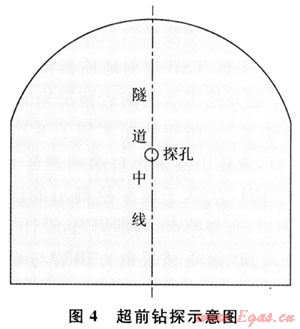 該方法屬于施工過程中的短距離地質(zhì)預(yù)報(bào)方法,需要采用超前鉆孔進(jìn)行驗(yàn)證。由于西氣東輸二線隧道斷面較小,沿掌子面打超前水平探孔1個(gè)。超前鉆探示意圖如圖4所示。