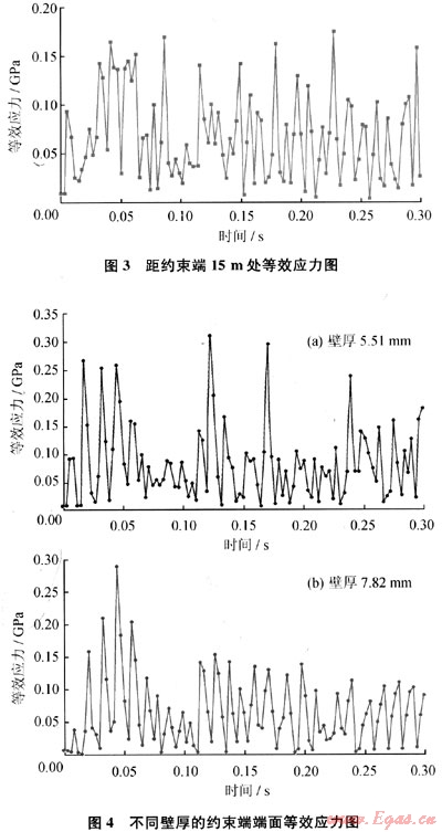 在相同的管材參數(shù)設置,同樣的外界載荷作用下,從圖4可知,30m的5.51mm和7.82mm兩種壁厚不同的射孔管柱,兩者模擬結果差異較大。壁厚7.82mm的射孔管柱約束端端面等效應力最小值σmin=0.55MPa,最大值σmax=287.86MPa,而壁厚5.51mm的射孔管柱約束端端面等效應力最小值σmin=6.81MPa,最大值σmax=311.98MPa,薄壁管柱的端面最大等效應力遠大于厚壁管柱的端面最大等效應力。