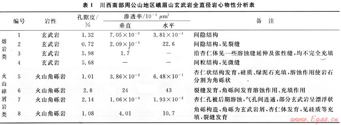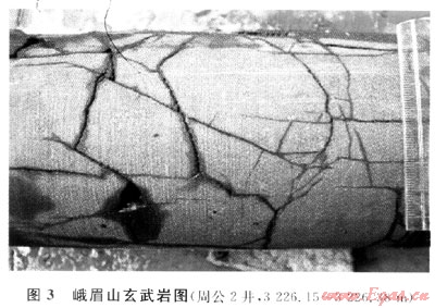 研究區(qū)玄武巖裂縫以成巖裂縫和構(gòu)造裂縫為主(圖3)。成巖裂縫包括因內(nèi)外散熱不均,冷縮作用形成的一些柱狀節(jié)理,收縮縫、晶間縫;構(gòu)造裂縫是構(gòu)造應(yīng)力的產(chǎn)物。按傾角分為水平縫、斜交縫、垂直縫,據(jù)巖心統(tǒng)計(jì),三者數(shù)量比例大致為1:2:2,其中垂直縫和斜交縫較寬(最寬可達(dá)2cm),水平縫較窄大多為全充填縫。巖石裂縫發(fā)育程度不均,一般(2~3)條/m、最多達(dá)12條/m;普遍發(fā)育寬0.05~2.0mm的微裂縫,周公2井薄片見遇率達(dá)55%,但多被充填或半充填并常伴溶蝕現(xiàn)象。綜上所述,峨眉山玄武巖是由原生氣孔、溶蝕孔洞和裂縫構(gòu)成的孔洞-裂縫型儲(chǔ)層。