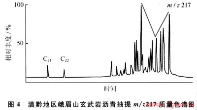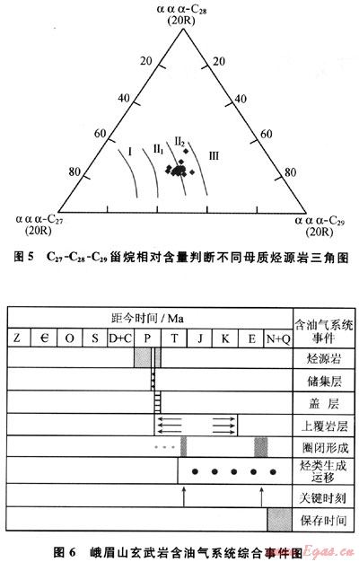另據(jù)玄武巖瀝青的m/z217質(zhì)量色譜圖(圖4),規(guī)則甾烷呈近“V”字形,C27占優(yōu)勢,反映水生生物輸入有機(jī)質(zhì)較多,利用C27-C28-C29甾烷相對含量判斷烴源巖母質(zhì)類型(圖5),表明除水生生物外,還有部分腐殖型有機(jī)質(zhì)的輸入;由于上覆的沙灣組在漢王場-青神-犍為-珙縣以東地區(qū),已相變?yōu)楹谏搸r夾薄層石灰?guī)r,有時(shí)可見薄層碳質(zhì)頁巖和煤層[3],故推測氣源可能有上二疊統(tǒng)煤系地層的貢獻(xiàn)。