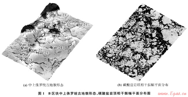 古地貌是控制一個盆地后期構造與沉積特征的主要因素,對沉積體系內的儲層發(fā)育與分布以及油氣藏的富集具有一定的控制作用。通過古地貌恢復技術與三維可視化技術相結合,可以從空間角度分析古地貌對鹽下礁體的控制作用。由于本區(qū)上覆膏巖、鹽巖與碳酸鹽巖速度的差異,極易形成強的巖性界面。另一方面,礁體發(fā)育區(qū)特別是含氣后,速度降低,波阻抗差減小,振幅也會降低;而礁間帶致密石灰?guī)r儲層,連續(xù)性好、振幅強,而因利用振幅屬性能較好的預測礁體發(fā)育區(qū)。相干屬性對地層的不連續(xù)性特別敏感,可以識別斷裂、裂縫的分布范圍。將古地貌與相干振幅屬性相結合,可以更好的預測礁體的平面分布。圖1-a是研究區(qū)B區(qū)塊楊古伊-恰什古伊氣田碳酸鹽巖沉積時的古地貌,鉆井證實,生物礁發(fā)育于古地貌較高部位。從圖1-b的相干振幅平面分布圖可以看出,生物礁發(fā)育部位相干性差、振幅為中低振幅,裂縫較為發(fā)育,儲層物性較好,與古地貌隆起區(qū)的分布一致。利用古地貌與相干振幅屬性相結合,在斜坡相帶已發(fā)現(xiàn)了楊古伊氣田和恰什古伊氣田。鉆井證實,斜坡帶的點礁群是擴大B區(qū)塊探明儲量的有利地區(qū)。