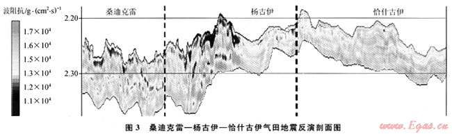 圖3為桑迪克雷-楊古伊-恰什古伊三維區(qū)自南西-北東向分布的反演波阻抗剖面。紅色低阻抗儲層,主要分布在碳酸鹽巖地層的上部,波阻抗值大約在15000g/(cm2·s);藍色為致密儲層發(fā)育段,具有低聲波時差、高密度的特征,與前述分析結果較為吻合。從反演結果可以看出,西南部桑迪克雷、楊古伊氣田波阻抗值相對較小,礁體較為發(fā)育,而東北部恰什古伊氣田波阻抗值相對較大,礁體發(fā)育程度較南部略顯致密。