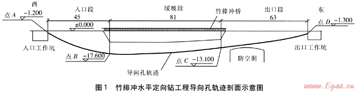 竹排沖水平定向鉆工程導(dǎo)向孔軌跡剖面示意圖見(jiàn)圖1(圖中尺寸單位為m)。